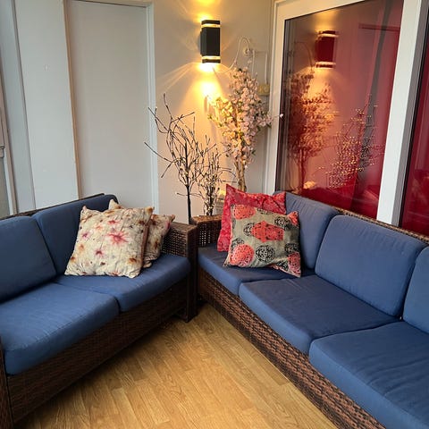 Den har kun stått 1 sesong ute på innglasset veranda, så den er som ny. Mørkegrå/sorte puter, sort rotting, bord, og buesofa. Kommer i 2 deler selve sofaen. Kjøpte den i fjor for 7999,- Med en tyngre person i hus så har man satt inn en støtteplanke der han satt, for ekstra støtte. Men alt er som det skal, bare litt ekstra støtte under ene sofaen.
