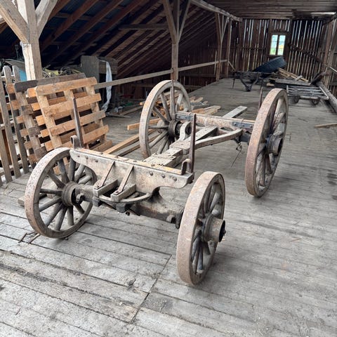 Gammel arbeidsbok /tømmervogn til hest. Selges som den er. Drag medfølger