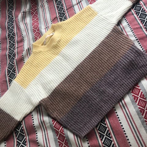 Strikka genser fra 80-tallet, god og varm. Ingen hull, men er brukt. Litt misfarging nederst ved armene. Eller noen synlig flekker eller skader som jeg kan se.
