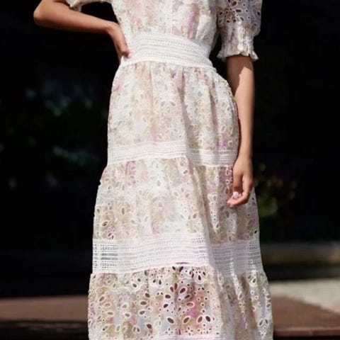 En trekvartlang off-shoulder kjole i gjennombrudd blonde. Kjolen har samle, regulerbare skulderbånd og bred volang øverst.