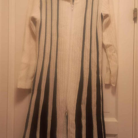Ankellang kåpe i marineblå bomull, to tommer og knapp til å lukke, splitt bak. Herlig å slenge på seg en sommerkveld/dag