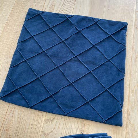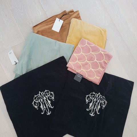 Putetrekkene er i tykt godt stoff med sommerlig blomstermotiv på gyllenbeige bakgrunn. Motivet i velur er uthevet. Baksiden er velur. 2 stk putetrekk med glidelås.De er kjøpt i England. Ubrukte.