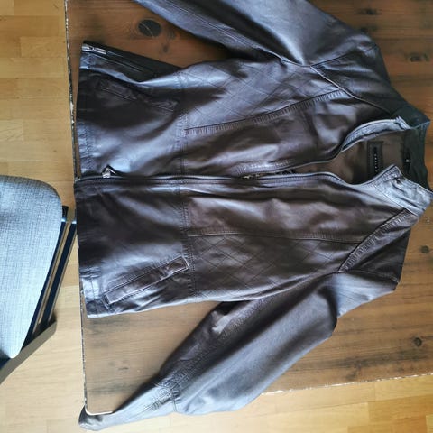 Lekker jakke fra Transit i skinn og stoff. Skinnet er svart og stoffet gråfargede. Kjøpt på en Second hand butikk på Frogner.