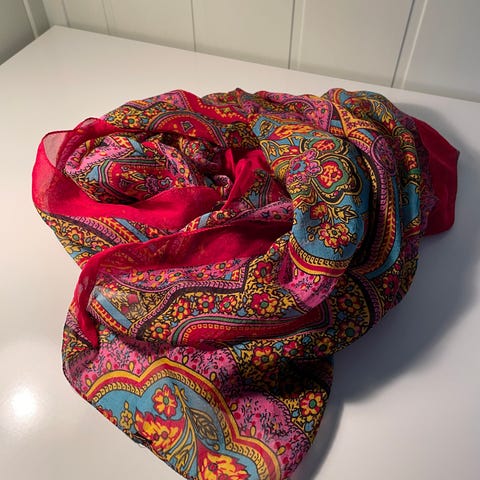 Flott Kenzo sjal i friske farger..kjøpt på Kenzo i Paris for noen år siden. 100% cotton. Målene er 118 cm × 65 cm. Lite og pent brukt.