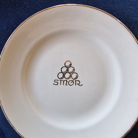 Nydelig fat, Egersund, med bred gullbård av vikingskip og seil og påskriften Hilsen fra Lødingen.