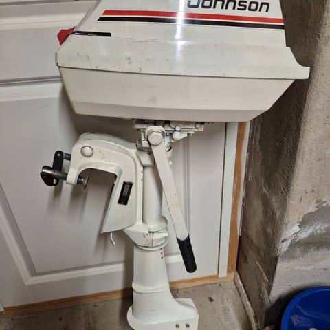 Ein johnson 4hk påhengsmotor selges i deler. Stop knappen har låst seg inne. Jeg klippet av ledningen til stop knappen og starta motoren med bensin rett inn i forgasseren fra flaske. Da starta den fint så motor virker til å være i orden. Men den trenger litt tilsyn og smøring. Selges uten garanti