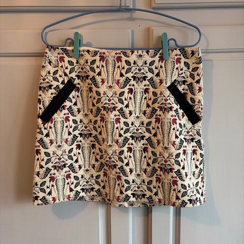 Miniskjørt fra Topshop i nydelige farger. Glansfullt stoff i grått med rosa og hvit stripe. Knapp og glidelås bak. 🤍