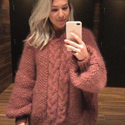 Havgløttgenser (design av Liljestrikk) strikket i Linde børstet mohair blend, farge rust (?), selges kr 450.