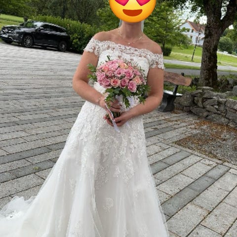 Brudekjole med blonder og åpen rygg. Kjøpt hos Ski brudesalong våren 2022. Opprinnelig størrelse 40, men tilpasset til størrelse 38. Ny pris 8900kr.