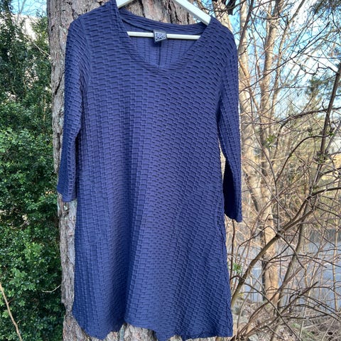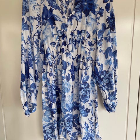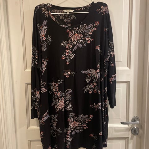 En lett og deilig kjole i 100% viskose. Litt lengre bak, fine detaljer i siden og strikk i ermene. Modellen heter Maggie.