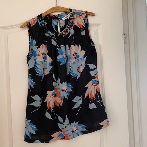 Ermeløs topp fra Leonardo i blandet stoff 80% bomull, i svart og hvit etnisk print. Lite brukt. Lengde ca 65 cm, bredde mellom ermene ca 45 cm