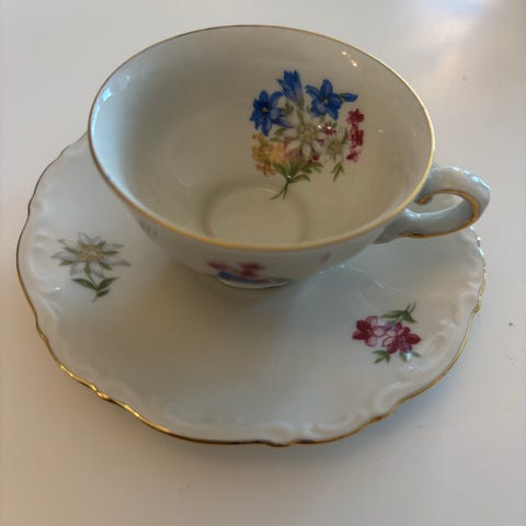 Den har nydelige blomstermotiv både på sidene, hanken og tuten.