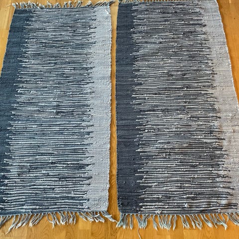 2 håndvevde ryer . Den lengste bredde 90 cm. , lengde 3 meter ( ikke målt med frynser ) Den minste bredde 90 cm , lengde 110 cm . Begge er tykke og ligger godt på gulvet . Selges samlet .