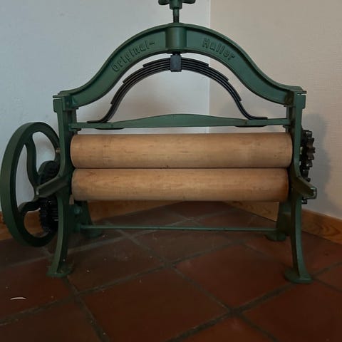 Gammel tøyrulle, høyde 1,5m, dybde 50cm, bredde 1,10m