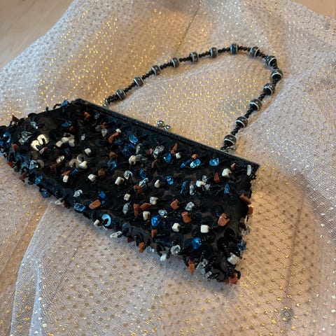 Fin til bunad. Som ny. Uten flekker og lås i orden. Ytre mål: Høyde ca 11 cm, Dybde Ca 8,5 cm. Bredde ca 11,9 cm. Har skulderbånd. Henger tilbudt på hofta for person på ca 170 cm. Kan knyttes ril kortere. Fin sort veske med perler og steiner.. Kan passe til bunad og flere antrekk., fantasien avgjør