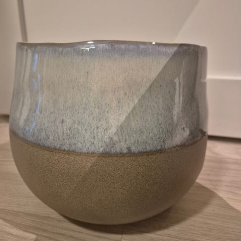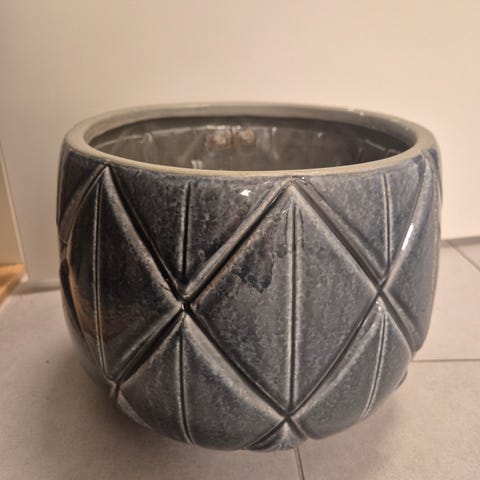Stor Cathrineholm med kjent dekor. Har noen skader i emaljen etter hanken, og bunnen er ikke helt plan. Den har vært i bruk til blomsterpynt, og egner seg godt til det, den rommer flere blomsterpotter. Hentes/sendes etter avtale.