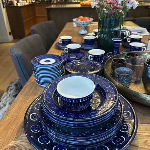 Dekoren Fiesta ble formgitt av Ulla Procopé for Arabia, Finland, på 1950-tallet, og var i produksjon mellom 1958-74. Modellen (XP) skal være utformet av Kaj Franck. Håndmalt koboltblå dekor på hvit bunnfarge. Utrolig flotte kopper!