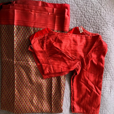 Kjøpt i India ca år 1965. Laget av den første syntet-silken. Aldri brukt.
