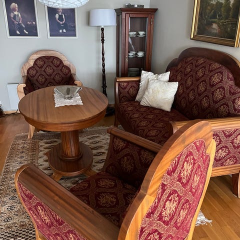 Salongen ble bygget til min bestefar ca 1920 av snekkeren på landbruksskole han gikk. Så denne finnes det ikke maken til. Salongen består av 1 sofa, 4 gubbestoler, 4 spisestoler og ett ovalt bord. Møblene ble trekt opp for ca 10 år siden og fremstår som meget fint. Vurderer solgt ved rett pris.