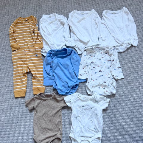 Pent brukte klær fra røykfritt hjem. Den ene heldressen har noen blåbærflekker som ikke går bort. Den medfølger gratis.