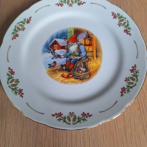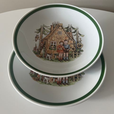 Selger eit pent brukt djuptallerken med tegninger av Hans og Grete (+ heksa og kakehuset..) Diameter 19,5 cm. Fin i glasuren, litt slitasje på gullkanten. Nokre år gammalt er det, og mange har sikkert gode barndomsminner frå dette.