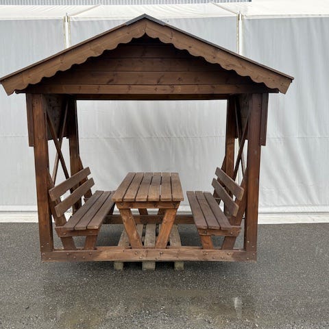 Grillen er dekorert med smed-aksenter på tregrener og blader. Grillen er mobil, med hjul. Nederst er det en metallhylle for ved, over – praktiske hyller-bord i heltre. Grill med lokk og hevet bunn, slik at du kan justere temperaturen og steke biffene raskere og jevnere.