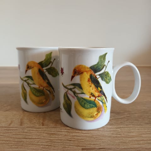 Fargerike retro kopp med fruktdekor.