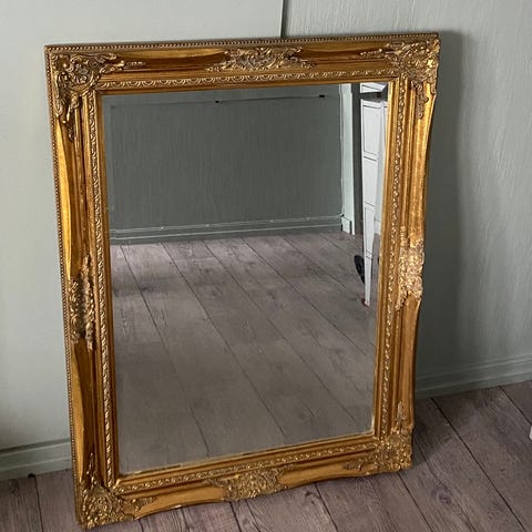Kult speil kjøpt på 90 tallet får mye penger. Bare stått lagret inne og står fortsatt inne. Kun tatt ut får å ta bilder. Bredde 89cm lengde 149cm