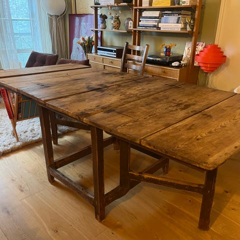 Sjarmerende og flott antikk slagbord fra 1800-tallet. Det er to klaffer som kan slås ned. Gjør det veldig praktisk og kan ta mindre plass. Det er overmalt svart med naturlige slitemerker på de rette stedene. Med tungt hjerte jeg selger det etter 25 år med mye glede både hjemme og til fjells. Plass til inntil 8-10 pers med begge klaffene oppe. 190 cm langt med begge klaffene oppe. 103 cm bredt.