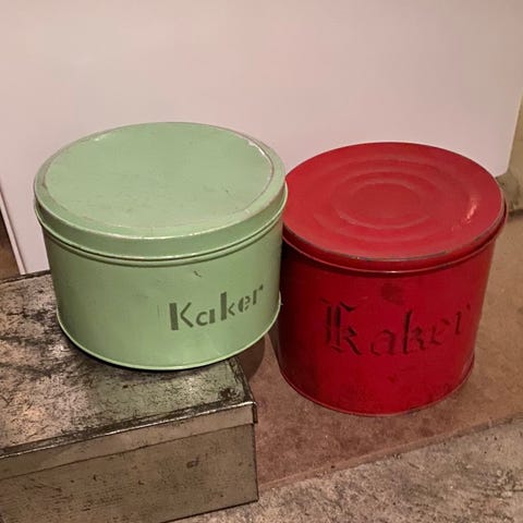 3 stk kakebokser i sett selges for 165,- Disse er kjøpt i England. Pent brukt, men med noen merker/bulker i metallet. Mye bruk igjen.