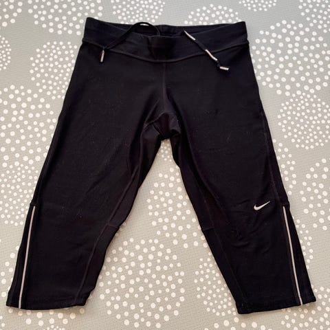 Treningsbukse i lav modell. Rette bein og god vidde i bena. Str 12, US 10. 100% Polyester. Tilnærmet ubrukt i svart farge. Tøffe lommer bak.
