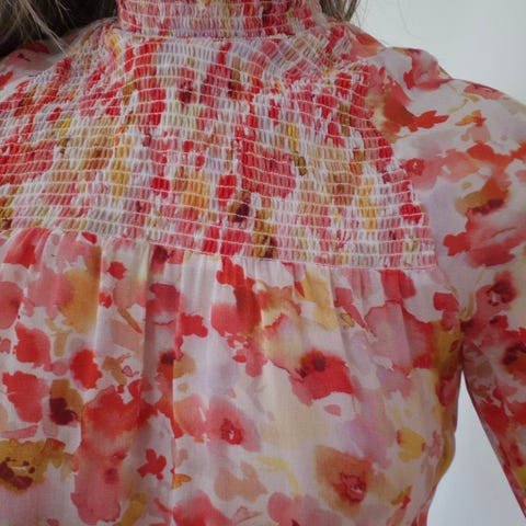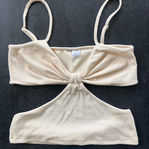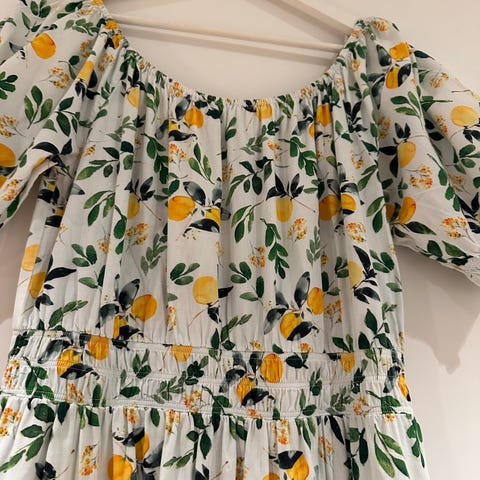 Vakker topp fra H&M sin «The Garden Collection» laget i 2010. I 100% resirkulert polyester. Luftig topp med fine volanger over skuldrene og snøring under bysten. Vært en favoritttopp som rett og slett føles litt liten nå. Er str38 og jeg bruker mer str40/M.