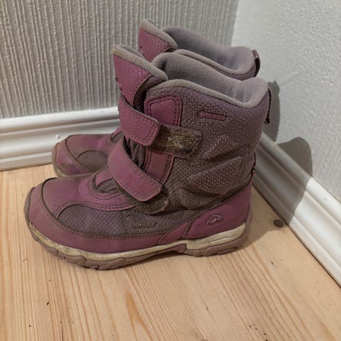 Gode sko til vinter, vår og høst. Jenta vår har vært veldig fornøyd med disse, men nå blir de for små til høsten. Lett og god, halvhøy modell. Tror de er kategorisert som vintersko fra viking, men det er ikke av de aller varmeste modellene de har. De er brukt, og har noen bruksmerker som fremkommer av bildene. Gått opp litt i søm foran, men har ikke betydning for bruken.