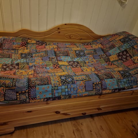 Mål på ramme: 76 cm dyp, 194 cm lang, 53,5 cm høy.