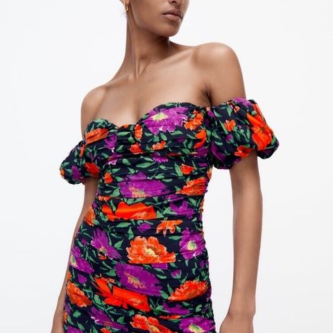 Superlekker blomsterkjole med volang-detaljer fra Zara. Kan se litt blå ut på bildene, men er sort. Fin til både høst og julebord. Brukt noen få ganger, fremstår som ny. Noen ganger brukt med et lite belte i velour for å variere fasongen og justere størrelsen, den passer alt fra xs-m.