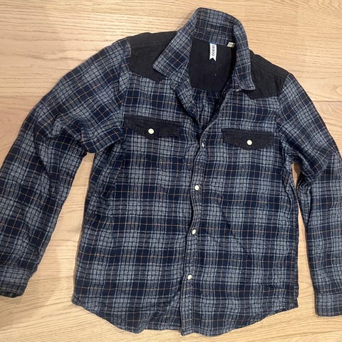 Herlig tykk flanellskjorte/jakke. Jenten min har bare tatt av lappen og prøvd den på, litt liten til henne. Str 158. Veldig god utenpå nå på våren, og på sommerkvelden. Selges 100kr pluss porto