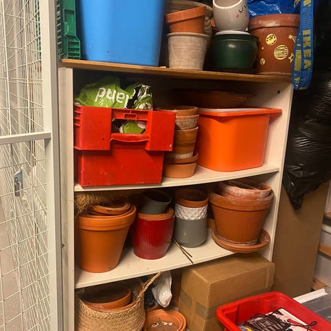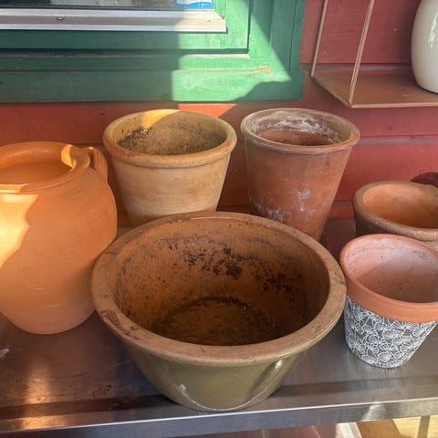 Terrakotta potter i ulike størrelser selges enkeltvis fra 10 kr avhengig av størrelse og stand. Pottene er hele og pene, og det er passende fat til en del av pottene.