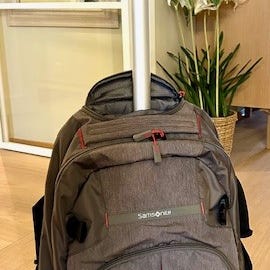 Sekken er av merket Samsonite og egner seg bra til laptop og annet kontorutstyr. Materialet er i sort nylonstoff i merket Samsonite. Sekken er ‘delt’ i to romslige rom m/ glidelås til hvert rom. I hvert av rommene er det ulike rom med og uten glidelås. I front er det også et rom m/glidelås og inn mot ryggen et rom u/glidelås. Skulderremmene er regulerbare og det er en bærerem i toppen av sekken. Når glidelåsene er dratt helt ned er det stoff på to sider som sørger for at gjenstander ikke faller ut!! Sekken er ren og hel…uten skader. Den er lite brukt . Grunnen til at jeg selger … den henger ikke så godt på mine skuldre. Mål: ca 40 cm høy og 28cm bunnplate. Sekken er litt avrundet øverst . Kan vise til kvittering ca. kr 960.