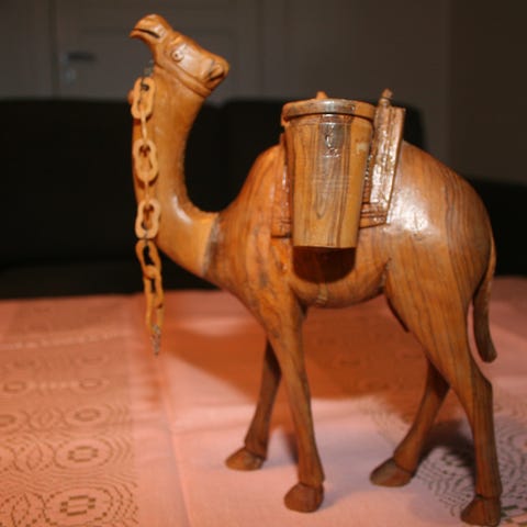 Jeg vet ikke hva material den er laget av, men det er ikke tre og ikke plast. Tror det er en type stein som er brukt til å lage den.