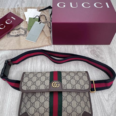 Kjempelekkert og nesten ubrukt beltbag i størrelse 75 fra Gucci. Brukt den 2 ganger og vesken fremstår som ny. Denne er vanskelig å få tak i. Jeg ønsker ikke bytte. Useriøset henvendelser besvares ikke. Dustbag, kvittering følger med. Ingen retur. Kjøper betaler frakt. Sendes som pakke med sporing