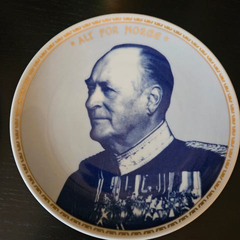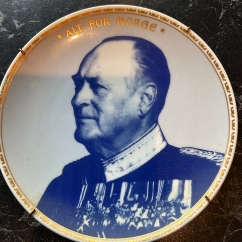 Porselenstallerken med portrettmotiv i midten og dekorert kant. Midtfeltet har rød bakgrunn og profilportrett, med inskripsjon nederst. Kanten er dekorert med mønster i kontrastfarge. Egnet som veggpryd eller samlerobjekt. Ingen oppgitt størrelse eller produsent.