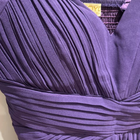 Lang kjole fra Coast i mørk lilla (grape), str 6. Stroppløs med halvåpen rygg, stripper til å sette på medfølger.