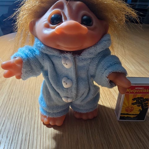 Selger mitt gamle lykktroll fra 80 tallet, fra Th.Dam Design. Made in Denmark. Rød filtkjortel, litt falmet bak.