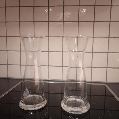Karaffel fra Hadeland. Det står en liten reklame i bunn på den, har to stk. pris er pr.stk.