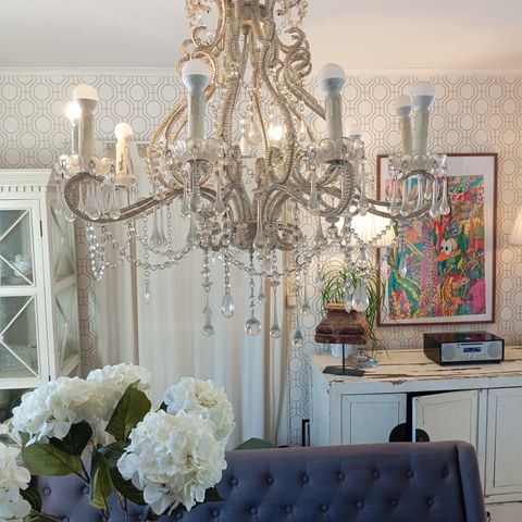 Klassisk lysekrone i hvit metall med 6 armer. Denne elegante lampen gir et tidløst uttrykk og passer perfekt i stuer eller spiserom. Lysekronen har plass til seks lyspærer, som gir en jevn og behagelig belysning. Den dekorative utformingen gjør den til et blikkfang i ethvert rom.