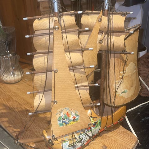 Spesiell lampe fra 1940-tallet av polarskuta Fram. Navnet sees i fronten, men litt svakt.. Massiv og tung, gods i metall/jern. Frostet glass i halvsirkel mellom skuta og det elektriske bak. Glasset knakk dessverre i to deler ved ompakking nylig… og må erstattes (glassmester).