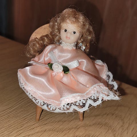9 cm høy, materialet minner om pappmasjé, men her er jeg usikker. Kjempe søt!