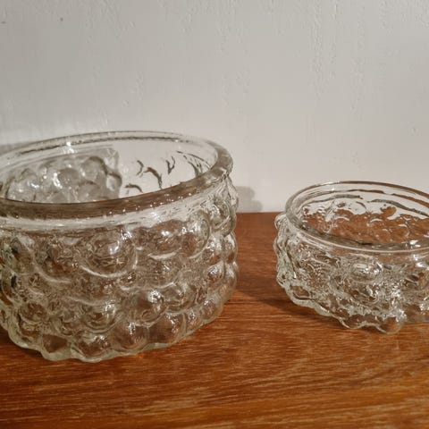 Flott glass bobble bolle,fra 1973 tallet. Har inge skader , hel og pen. Minimalt med bruksmerker . på åpningen 18 cm, høyde 9,8 cm