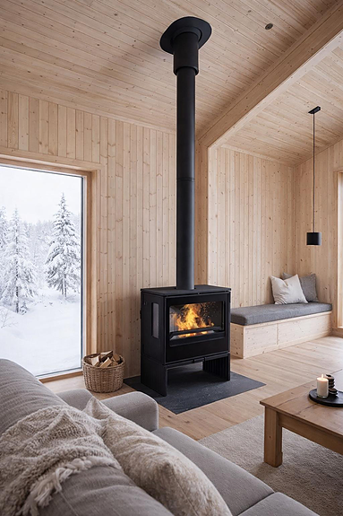 Rentbrennende stilig vedkomfyr med både moderne og klassisk design i ett. Leveres hele antrasitt sort, grønn og rød/burgunder lagervare.