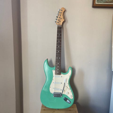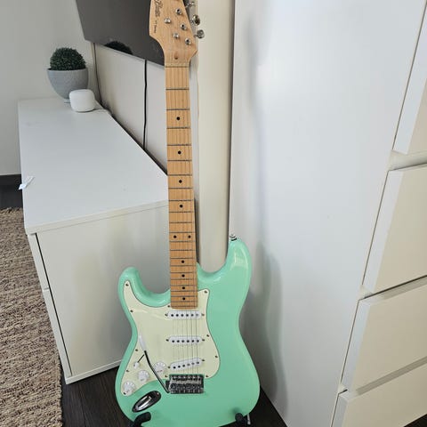 Japansk-produsert el-gitar fra aria, meget god i forhold til prisen. Veldig kul mint-grønn/ sea Moss green farge.